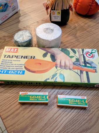 I have two Max Tapener hand tying machines, one new in box and one used. The new one is $50 and the used one is $40. I also have 6 rolls of white replacement tape that is $2 per roll and 4 rolls of green tape that is $2 per roll. I have two boxes of staples that are $6 per box. My husband used the machines for tying grape Vines to the trellis.